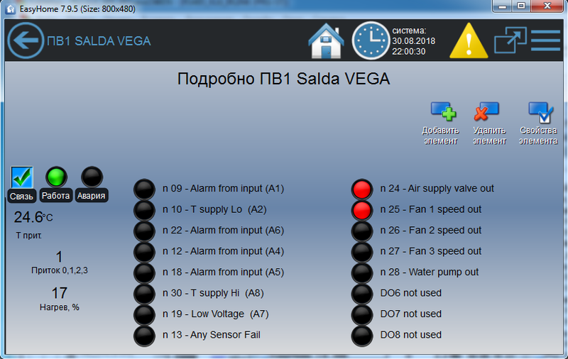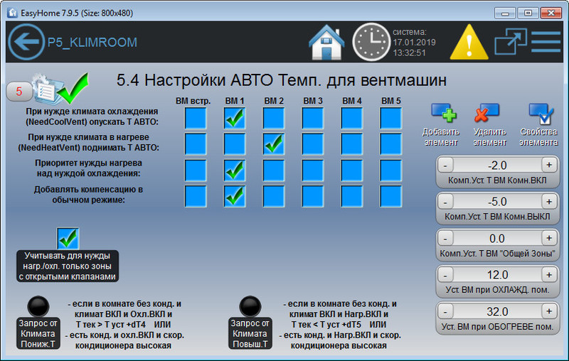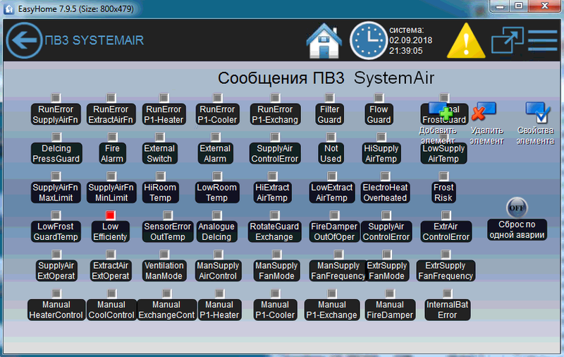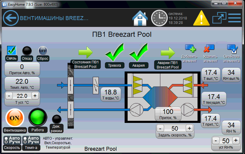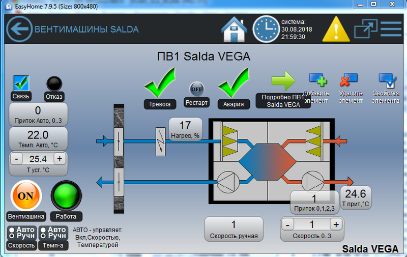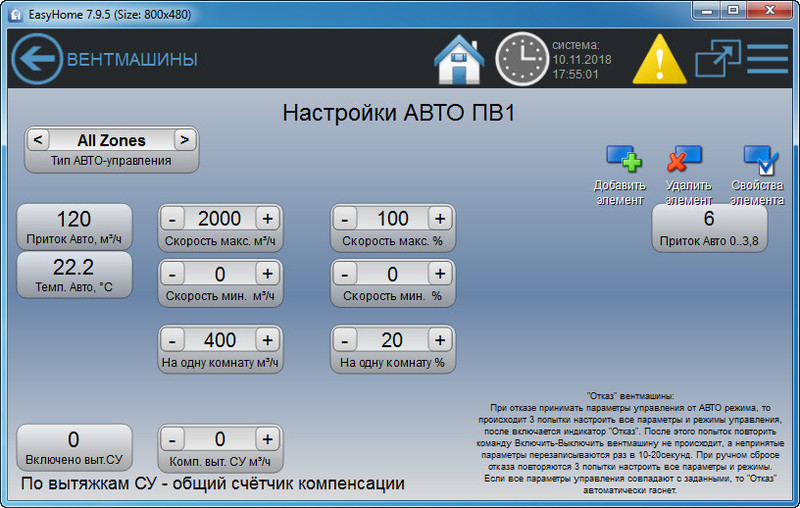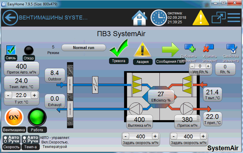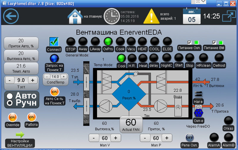 Вентиляция необходима в любом современном здании, система EasyHome позволяет гибко управлять скоростью и температурным режимом для максимального комфорта и энергоэффективности. Возможна привязка вентустановки к отдельному помещению или к группе помещений одновременно по усреднённым требованиям климата в них. Система позволяет вести мониторинг базовых параметров и своевременно получать сообщения об необходимости обслуживания или неисправностях агрегатов. Базовая функциональность определяется самой вентустановкой и встроенным управляющим контроллером поставляемым в комплекте. К одному контроллеру системы Умного Дома EasyHome можно подключать до 5ти вентустановок по интерфйесу RS485 и одну для прямого управления элементами вентмашины.