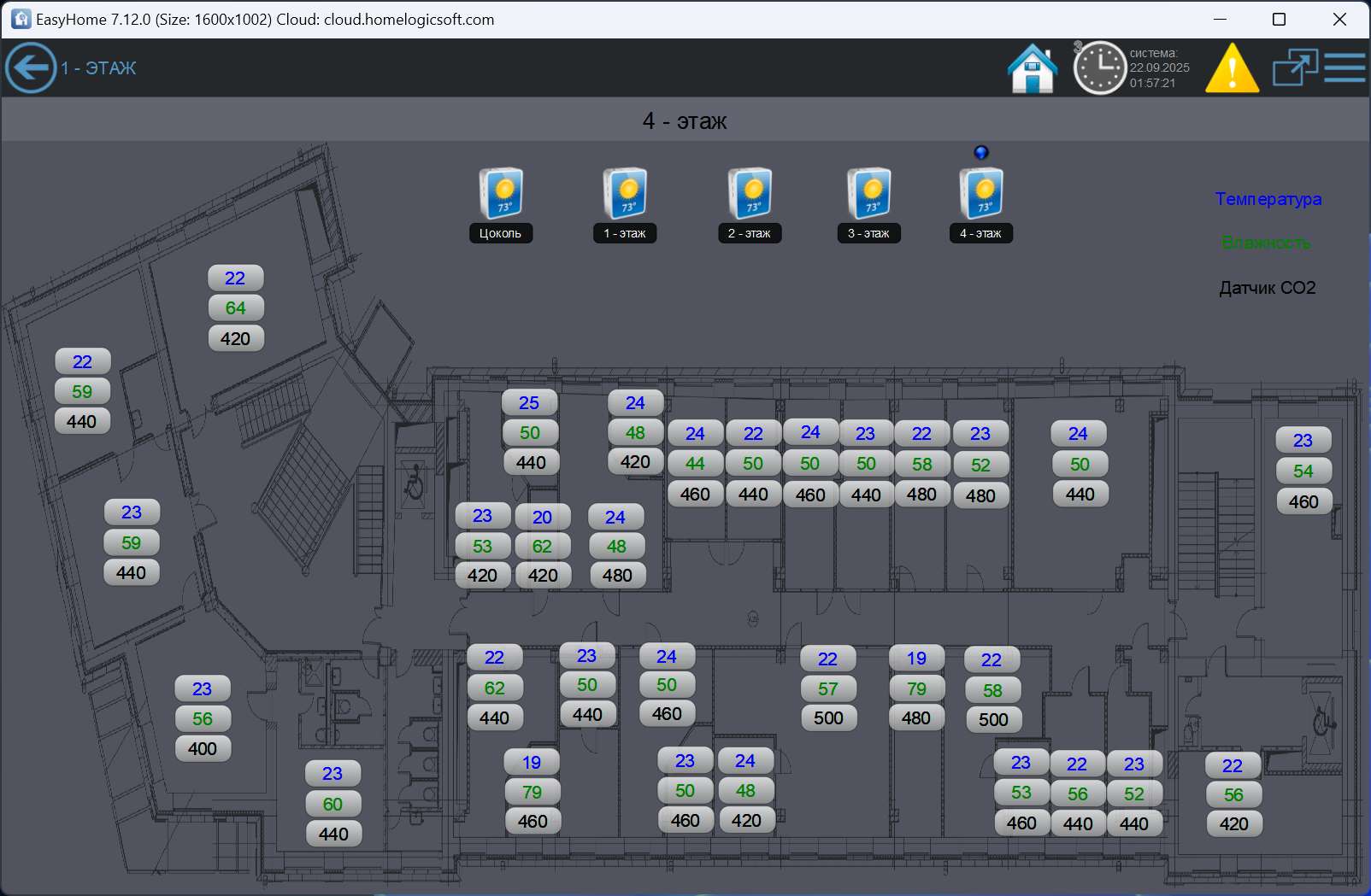 2) Счётчики количества включенных термостатов и средних температур по этажам (до 7ми).