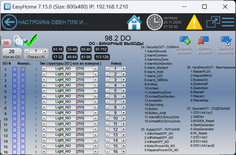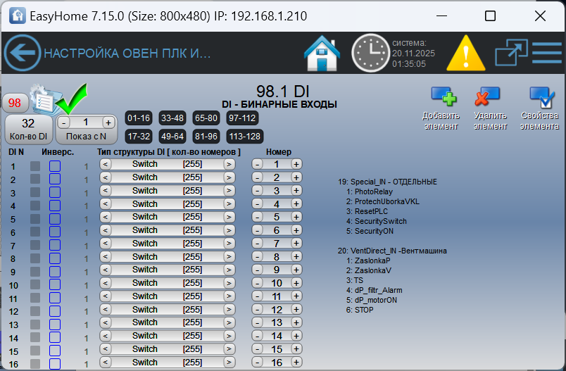 Привязки физических входов и выходов к переменным алгоритмов выполняются на странице инженерного интерфейса