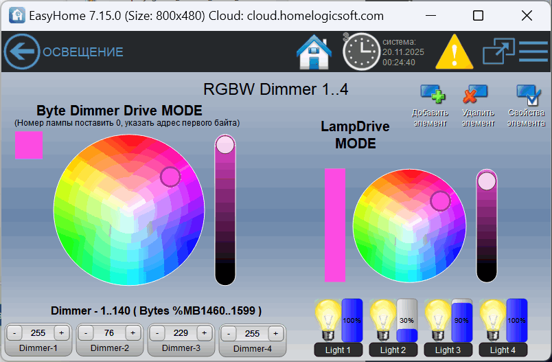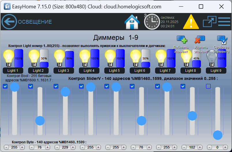 7) Для групп диммирования 1..140 доступно прецизионное диммирование слайдером с точностью 1/255. Для всех групп 1-255 доступно диммирование с точностью 10%.