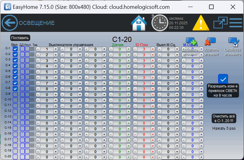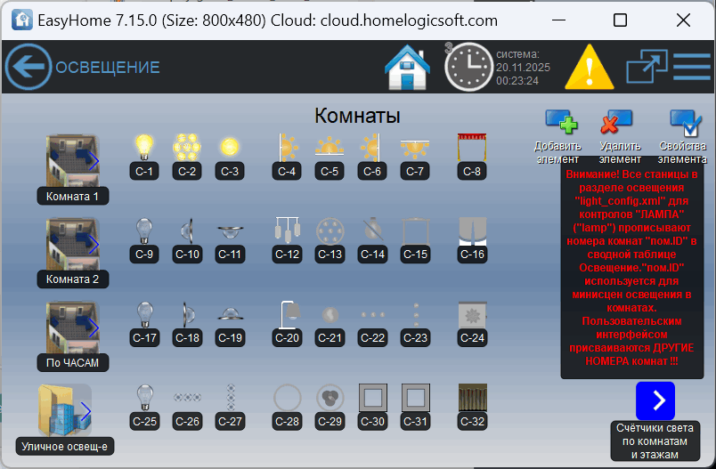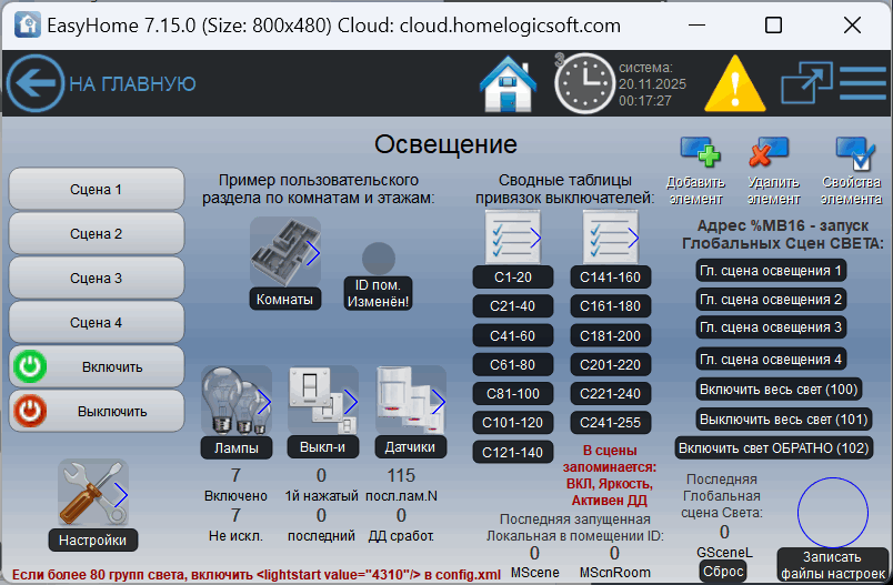 Страницы ИНЖЕНЕРНОГО интерфейса для настройки ОСВЕЩЕНИЯ в умном доме EasyHome: