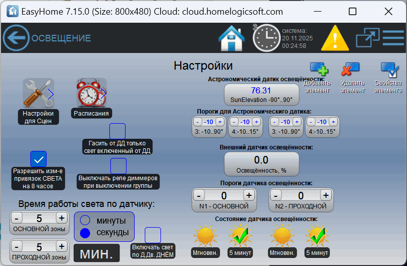 Дополнительные функции управление освещением в умном доме EasyHome: