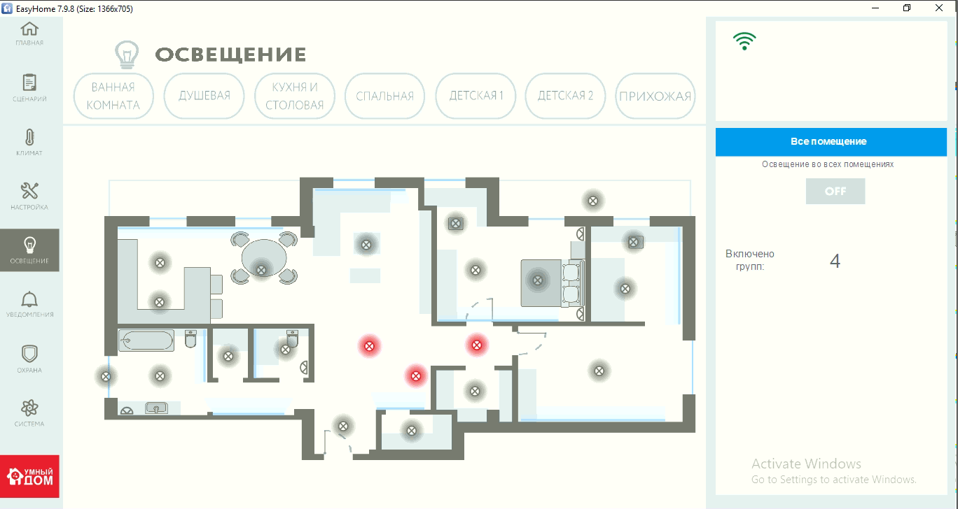4) Для всей системы освещения предусмотрено 4 глобальных сцены света, в которой для каждой комнаты выбирается минисцена для активации
