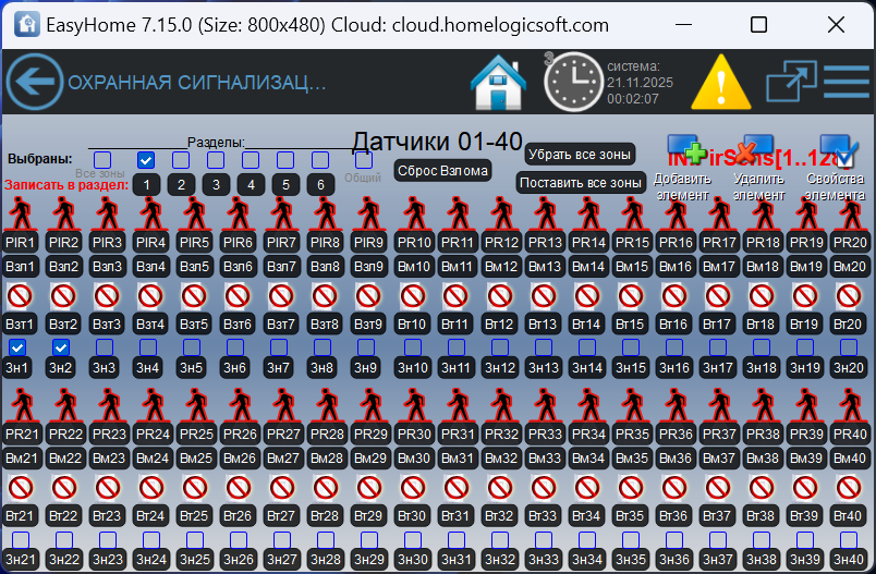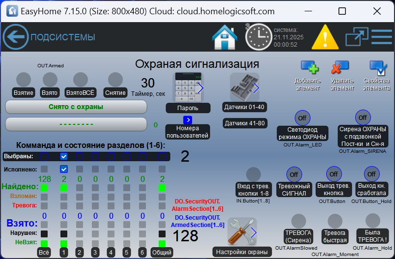 3) Графическая индикация по всем разделам и общая по всем зонам: найдено, взломано, тревога, взято, нарушено, не взято