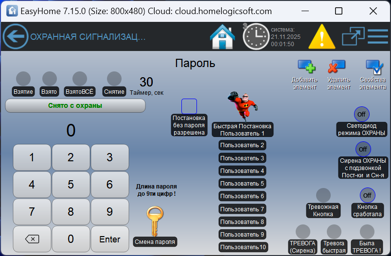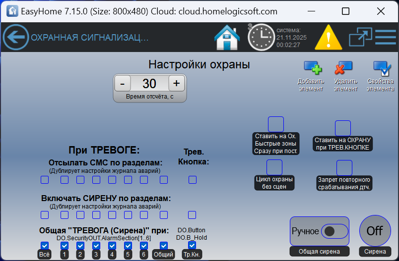 Базовые функции охранной сигнализации в умном доме EasyHome: