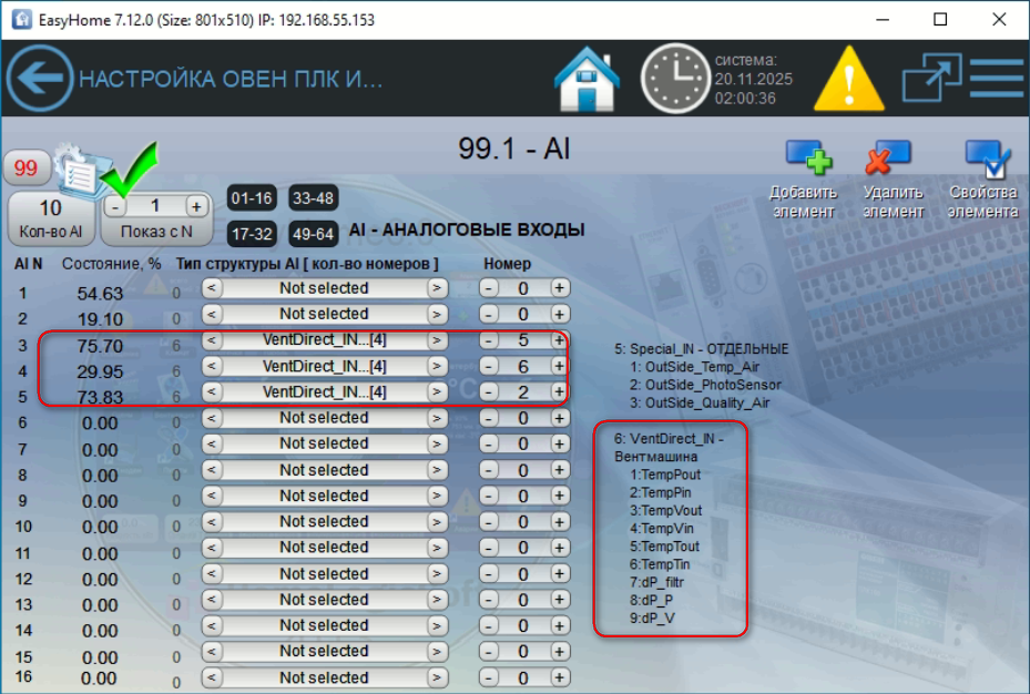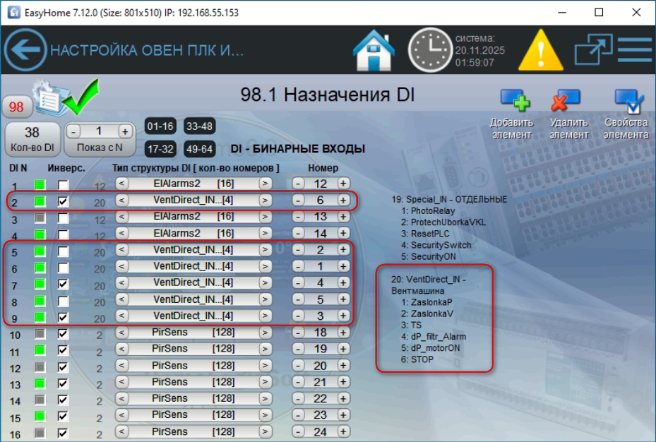 Физические входы для прямого управления оборудованием ВЕНТМАШИНЫ: |
