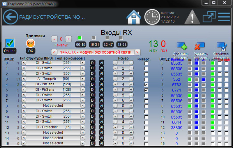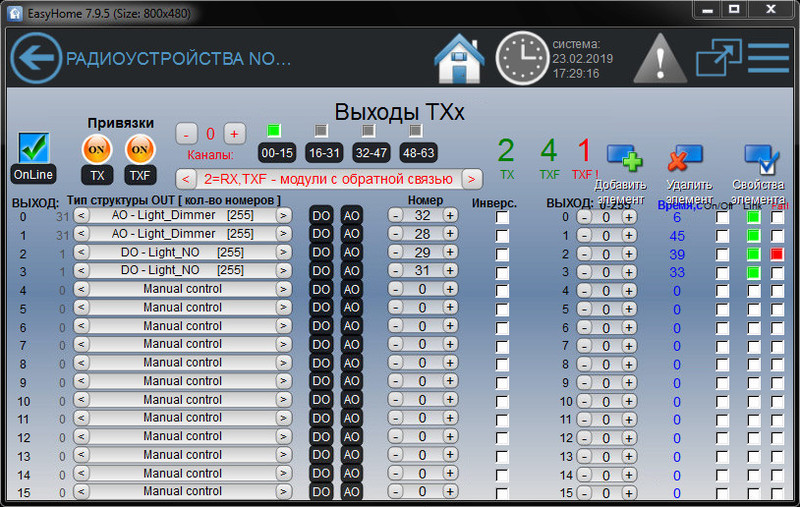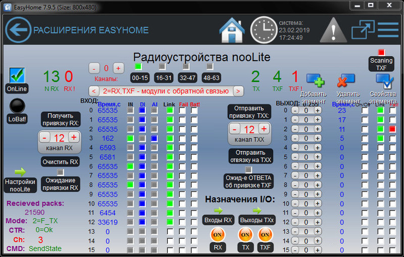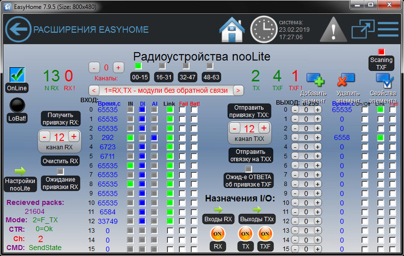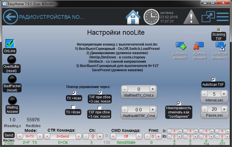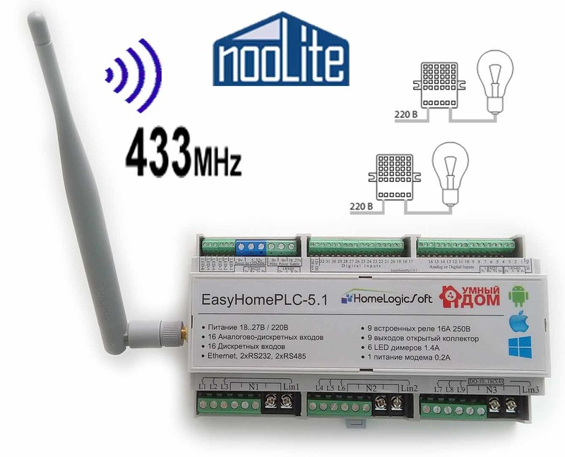 Интеграция с EasyHome выполнена с помощью адаптера nooLite MTRF-64 (впаивается на процессорную плату контроллера EasyHomePLC-5.x или подключается через адаптер RS232 во внешний порт любого контроллера)