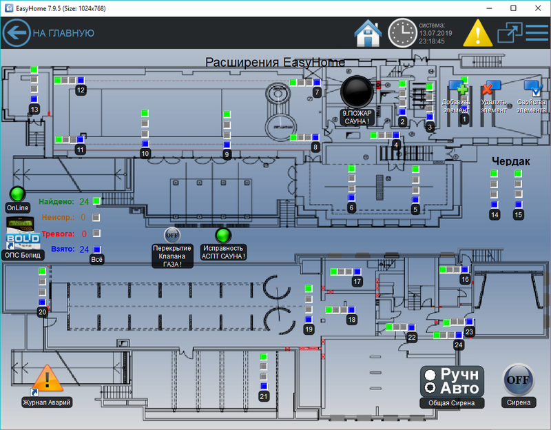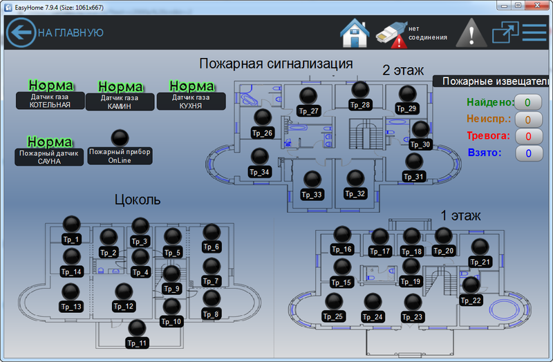 - получать подробную информацию о состоянии датчиков пожарной сигнализации