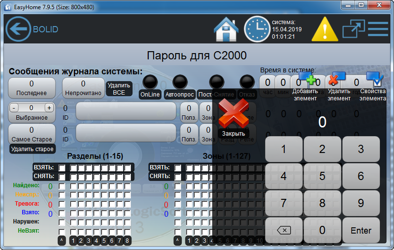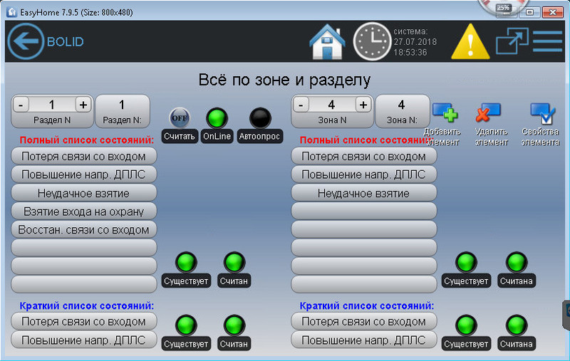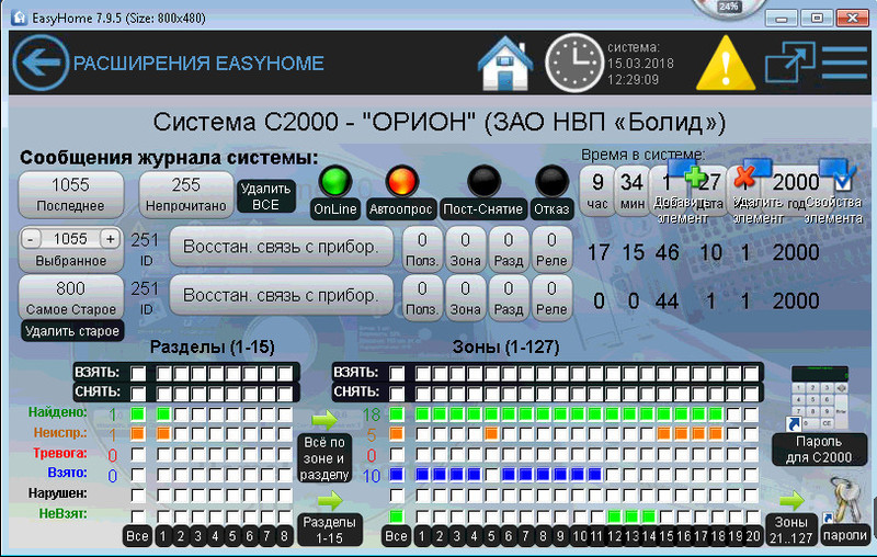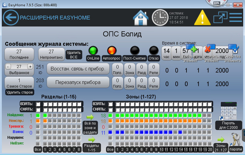 - визуализировать на графическом интерфейсе текущие параметры зон 1-127 (адресных датчиков) и разделов 1-15