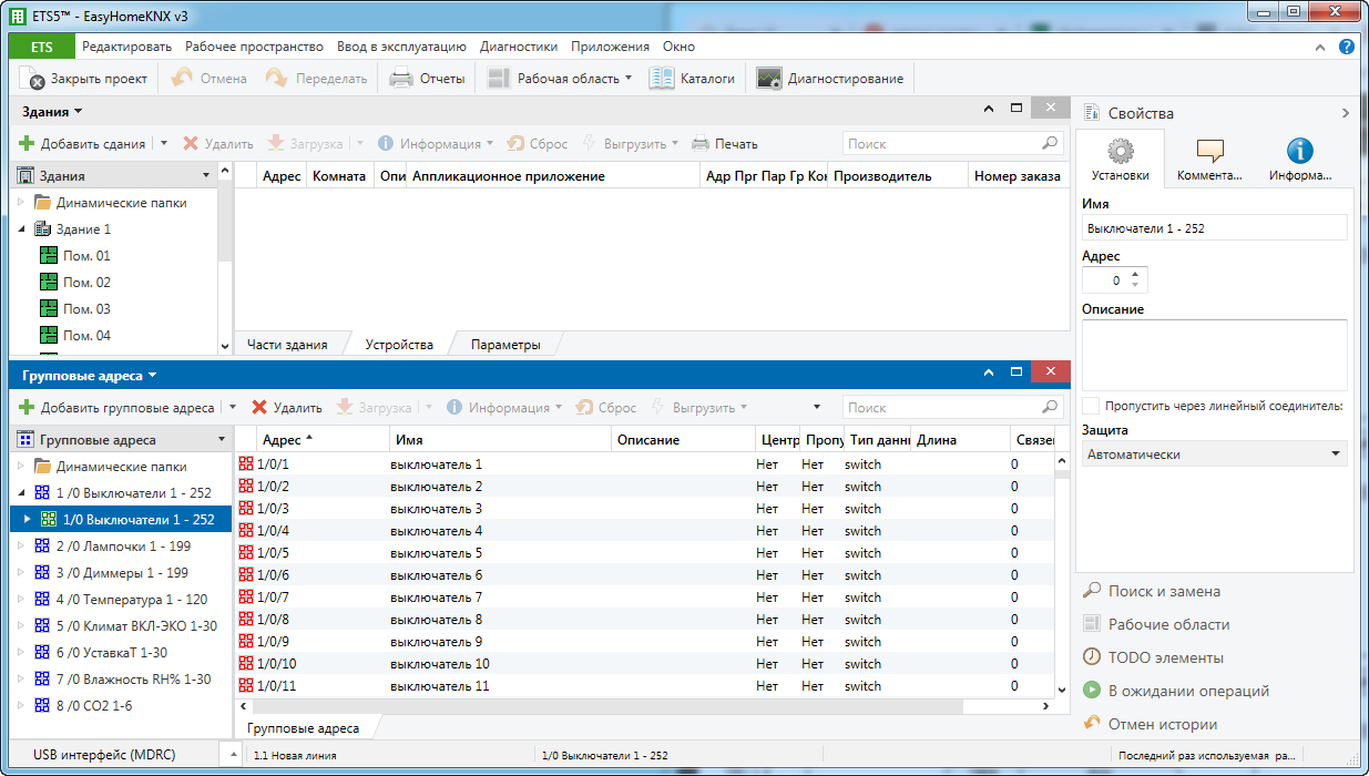 В системе EasyHome предусмотрена адресация групп однотипных данных в сеть KNX и из сети KNX, которые должны быть последовательно адресованы. Для упрощения адресации переменных устройтсв сети предоставляем готовый шаблон переменных для системы KNX для привязки точек ввода-вывода устройтств для ПО ETS5: