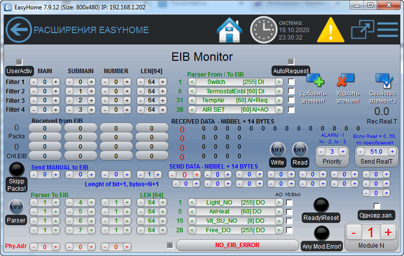 Применимо только в составе контроллеров Beckhoff. В ПО EasyHome поддерживается одновременная работа до 8ми модулей в составе одного контроллера. Может выдавать до 20ти телеграм в секунду. |