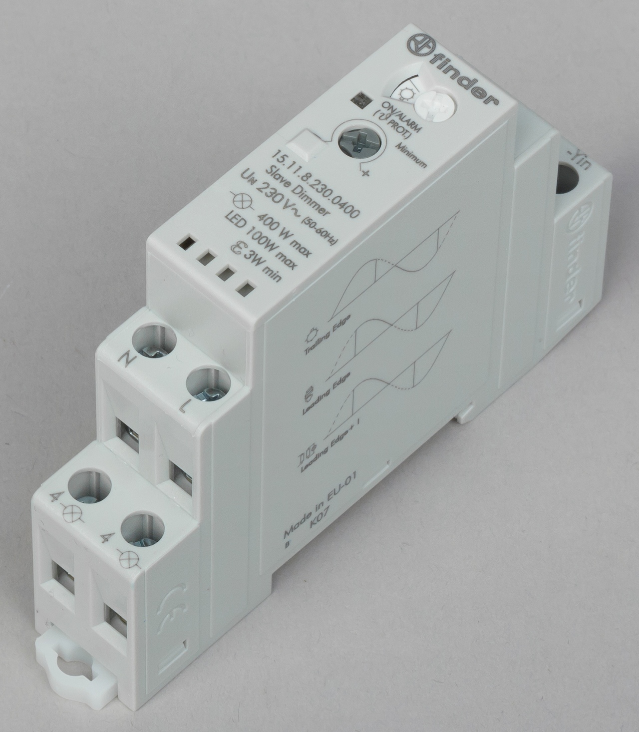 Для тестирования также использовался внешний управляемый диммер Finder 15.11, который принимает на вход аналоговый сигнал от 0 до 10 В и в соответствии с ним регулирует нагрузку сети питания 220 В. Данная модель поддерживает работу с лампами накаливания до 400 Вт, а также со светодиодными и люминесцентными лампами до 100 Вт.