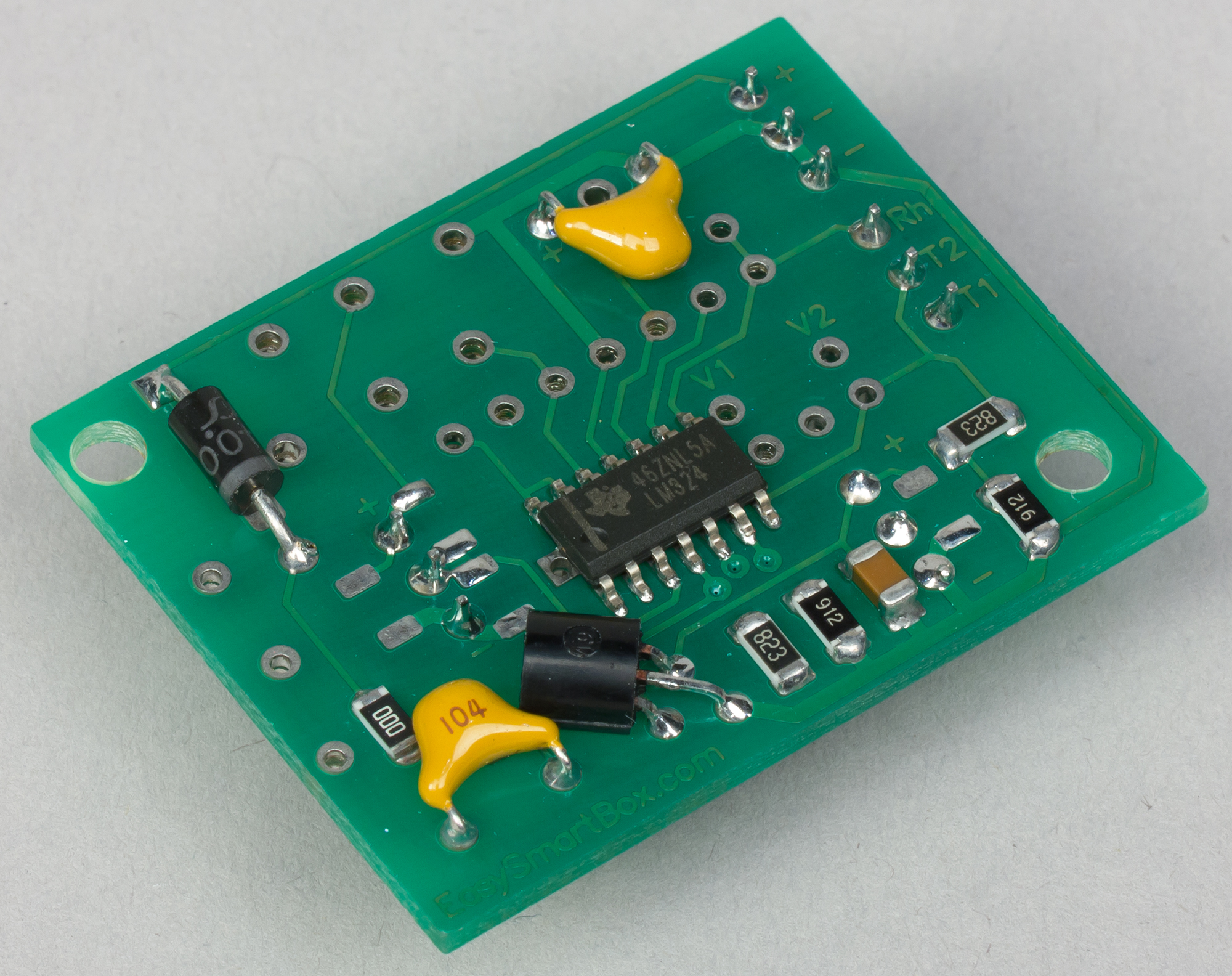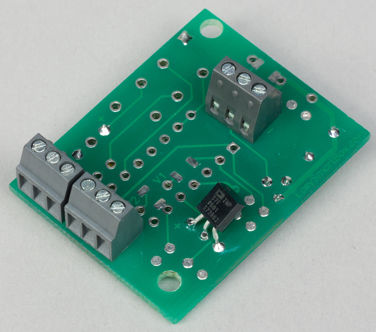 В частности, это могут быть температуры (от одного до трех сенсоров, в том числе выносные, например, для пола, улицы или специальных помещений), влажность (один на плате) и освещенности (тоже один на плате). Датчик требует питания 12 В и имеет на плате микросхему операционного усилителя и другие компоненты.